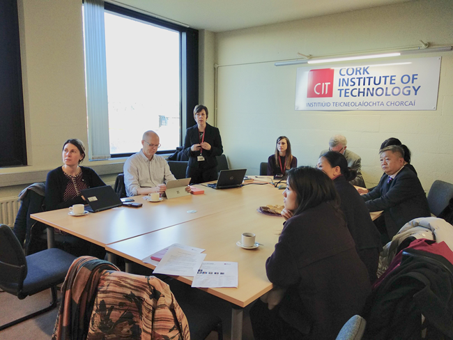 爱尔兰科克理工学院外事副校长Orla Flynn(左3)向中山大学新华学院代表团介绍科克理工学院