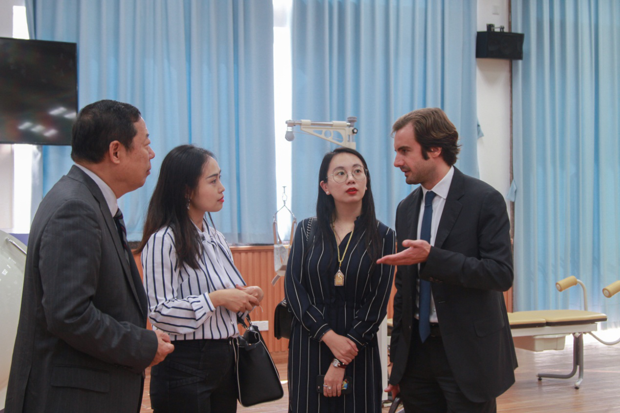 法国巴黎宜世学院国际项目负责人Mark Soubiran(右一)一行参观古天乐代言太阳集团网址多功能康复实验室