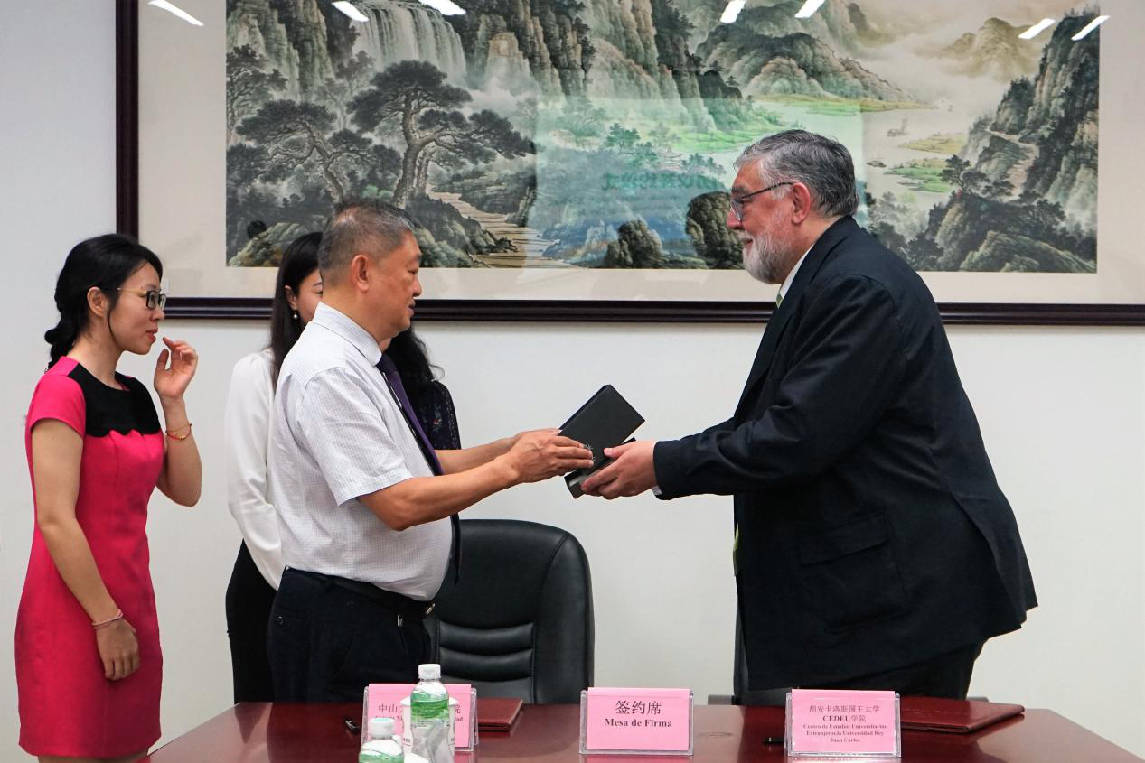 5月15日上午,中山大学新华学院与西班牙胡安卡洛斯国王大学CEDEU学院签署合作协议仪式在东莞校区格物楼举行。西班牙胡安卡洛斯国王大学CEDEU学院校长Juan Alfonso Cebrián Diaz(以下简称“Alfonso Cebrián校长”)一行2人,古天乐代言太阳集团网址校长王庭槐,外事处、外国语学院代表出席签约仪式。本次签约会议由古天乐代言太阳集团网址外国语学院执行院长廖益清主持。