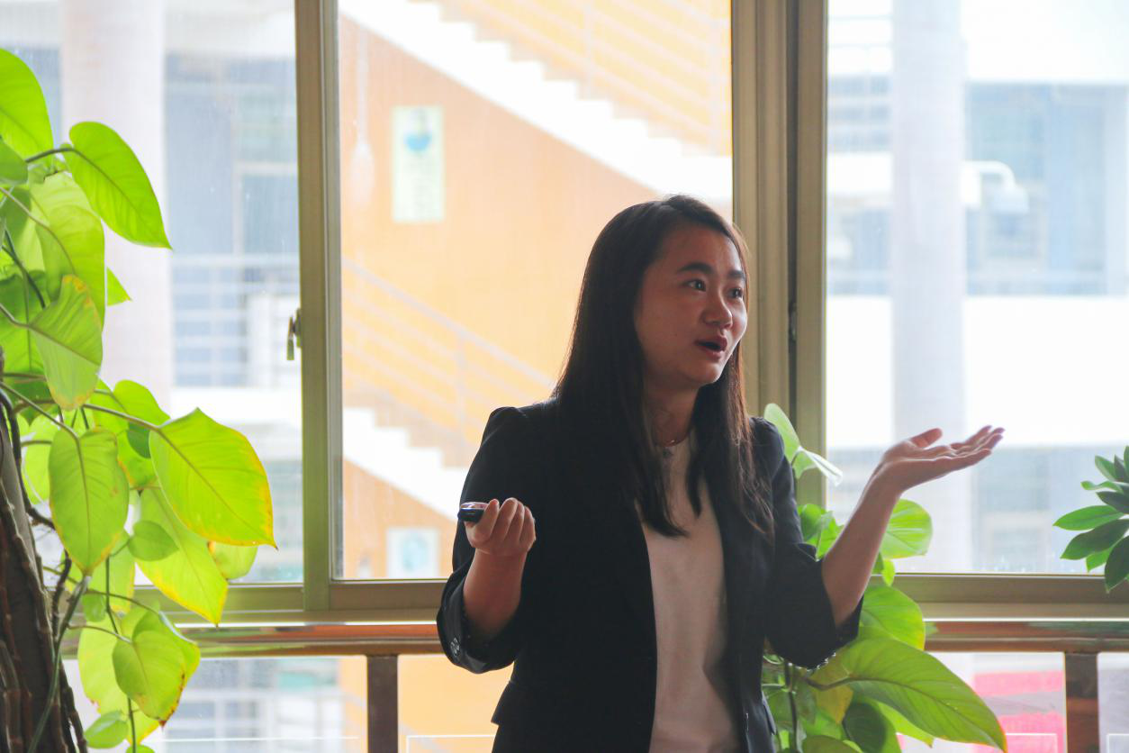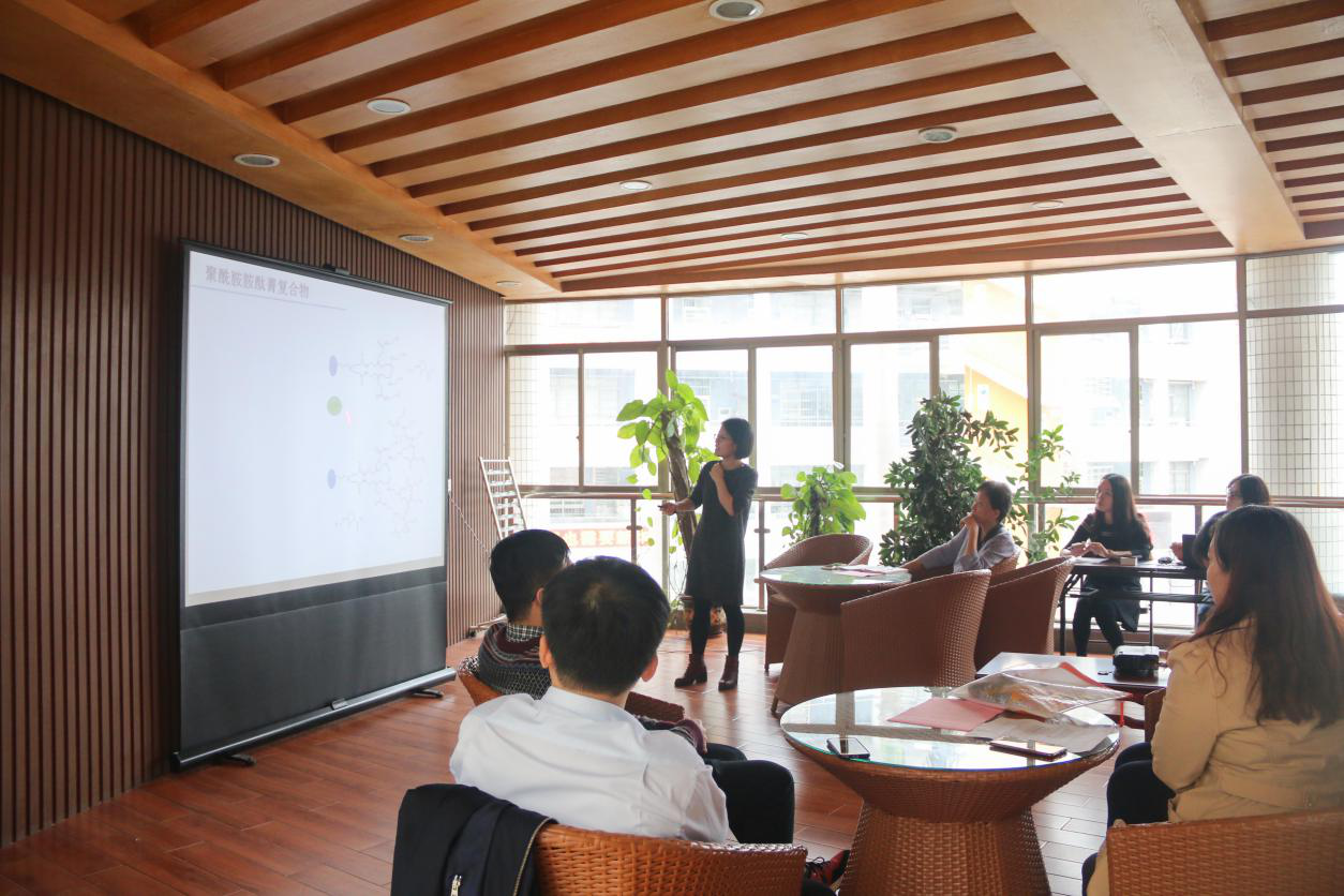 药学院成燕琴博士就当前研究的“靶向抗癌药物的合成”内容和科研设想在会上与大家进行交流。药物治疗是指用一切有治疗或预防作用的物质用于机体疾病,使疾病好转或痊愈,保持身体健康;基因治疗是指利用遗传学的原理通过基因来治疗人类的疾病。成博士综合药物治疗和基因治疗的优点,采用更为高效率、低毒性、多功能的联合治疗方法对“靶向抗癌药物的合成”开展研究。沙龙现场,她对聚酰胺胺酞菁复合物、炔基叔丁基酞菁的合成路线、叠氮聚酰胺-胺的合成路线等内容进行生动形象的分析讲解。成博士指出,当实验过程中遇到瓶颈时,不要立即否定自己的研究成果,应当留意科研细节,观察实验周边环境,适当改进科研条件。“不管从事何种职业,都需要在磨合中慢慢成长。”成博士总结道。