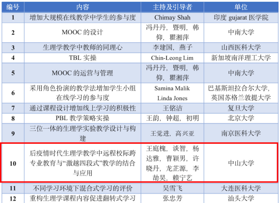 王庭槐带领报告团队开展题为《Combination and application of long-distance inter-university inter-professional education and the Online Four-step Teaching of Encouraging and Sharing in physiology teaching in post -COVID-19 era》(《后疫情时代生理学教学中远程校际跨专业教育与‘激越四段式’教学的结合和应用》)的工作坊分享汇报。王庭槐首先介绍了“激越四段式”教学法的创建及其由来,接着由团队成员依次介绍了线上跨学校跨专业激越四段式在生理学中的应用、激越四段式的step1至step4的实施过程。在介绍激越四段式step4的实施过程中,古天乐代言太阳集团网址学生彭诗斯、田丽阳分享了在激越四段式学习过程中获得的学习成果。