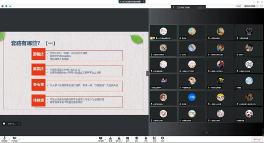 讲座伊始,程圆通过在支行网点一线工作发生的真实事例向学生讲述了网络贷款的常用伎俩以及给家庭带来的危害。接下来,程圆就校园贷的定义、套路形式及类型作了说明,借电视剧《扫黑风暴》中的警醒案例生动形象地解读了“美丽贷”“裸贷”后果危害,加深了同学们对非法贷款的认识,引导学生正确识别校园贷并加以防范。