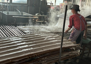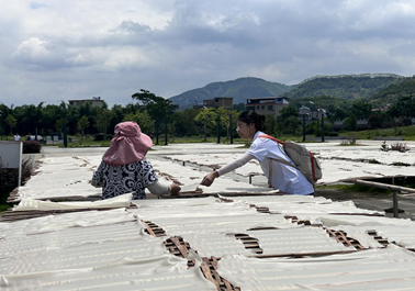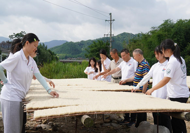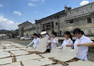 在宰相粉晾晒场,队员们参观宰相粉的晾晒过程,并亲身参与宰相粉的制作。队员们将宰相粉米皮整张剥下来,平铺在竹筛上进行晾晒。做法看似简单,实践实则艰难,一不小心就会将米皮撕烂。通过实践,队员们感受到不管是非遗项目的传承或是非遗项目的经营,都离不开匠人们的不懈坚持,队员们也立志学习、传承弘扬这种精益求精的工匠精神。