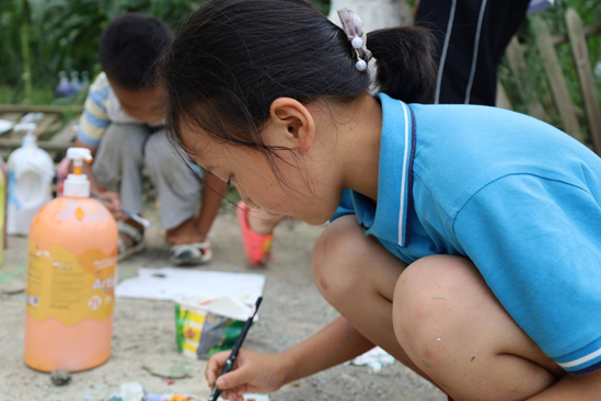 绘画课上,在实践队员们的指导下,小朋友们在草帽、石块上进行涂鸦创作。小小的画纸上,展现出孩子们丰富的想象力和创造力。绘画结束后,小朋友与队员们分享了创作想法与他们心中的“美”。通过美育课堂的开展,小朋友们在乐趣中体验感悟到了“美”的内涵,队员们也被小朋友们的学习兴趣、天马行空的创作想法深深打动。