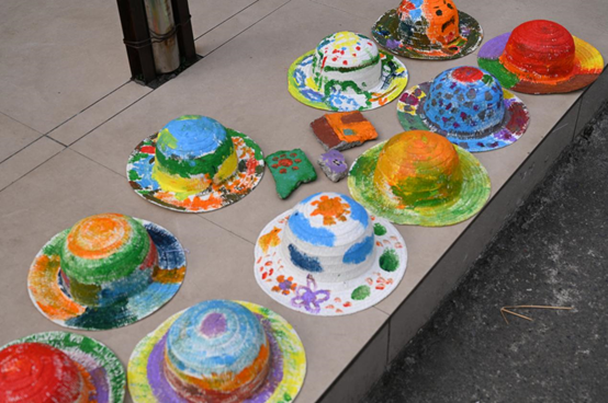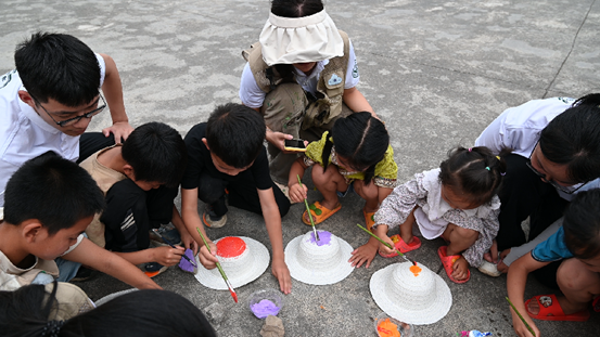 队员们指导小朋友们在草帽上进行涂鸦绘画