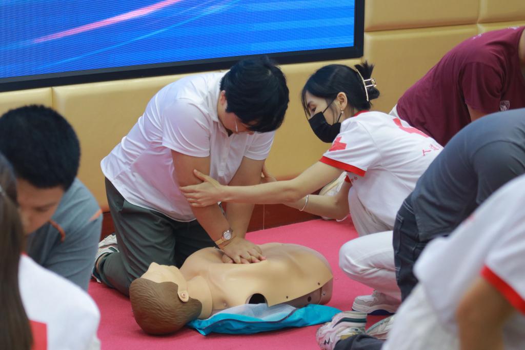 启动仪式结束后,应急救护大讲堂正式开启。林燕清、刘小巧、周毅恒三位来自红十字会应急救护核心师资的讲师分别带来了心肺复苏术、AED的使用、气道异物梗阻应急救护、校园常见意外伤害等四个专题的精彩授课。他们通过理论讲解和现场演示的方法,向师生讲解各种急救技能,让师生充分了解急救知识的重要性以及应对突发情况时的正确方法。在实操环节,与会师生学习情绪高涨,踊跃参与练习,培训讲师耐心指导并规范大家在施救过程中的动作要领。