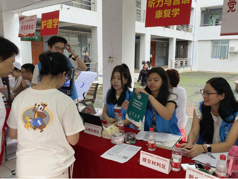 我为师生办实事,党员先锋在行动。为鼓励新生积极向党组织靠拢,让党旗在迎新一线高高飘扬,康复系、听力系党总支在迎新报到现场设立党员迎新服务站,学校、学系领导亲临现场指导迎新工作。师生党员志愿者佩戴党员徽章,为新生介绍入党流程、解答相关疑惑,提供现场咨询服务。