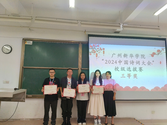 经过激烈角逐,比赛评选出一等奖2名,二等奖2名,三等奖4名。健康学院的吴凡熙、中国语言文学系的戴惠钰在比赛中脱颖而出,将代表学校参加“2024中国诗词大会”广东省选拔赛。