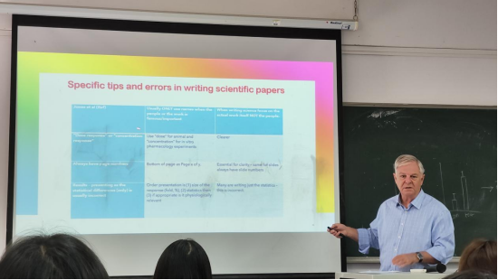 Peter James Little AM教授作题为ScientificPaper Writing Guidance主题分享。他从三个方面对与会教师们进行指导:一是结合多年的审稿和指导论文经验,列举了20余个常见的写作问题,并给予指导意见;二是结合大型药物临床试验等实例,对论文数据分析中常用统计学指标的意义进行讲解;三是对近年来高影响力的期刊论文发表难度加大的现状及原因进行剖析,并为学院教师提出有效改进建议。