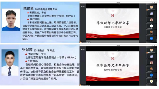 2018届优秀毕业生陈俊延和张珈源以线上形式分享了一系列考研备考和就业求职经验。他们结合轻松经历,深入浅出地介绍了考研的报考流程、备考技巧和心得体会,以及自己求职的经验和方法,鼓励同学们勇敢追求自己的梦想,奋勇拼搏、为实现个人价值而努力奋斗。