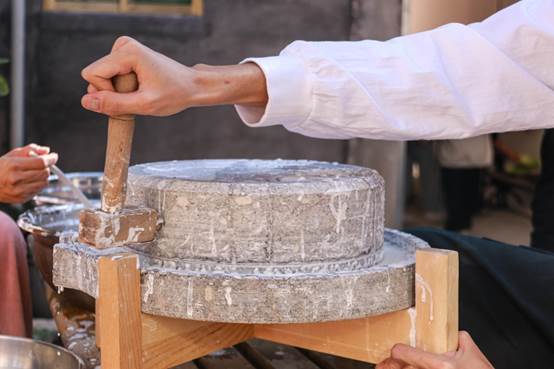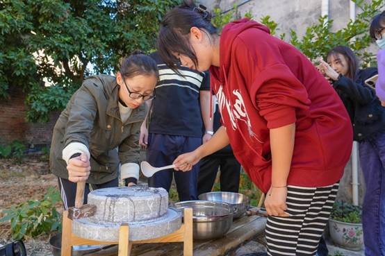 磨肠粉体验区内,在老师的指导下,师生们亲手操作石磨,体验了从磨米到制作肠粉的全过程。尽管过程中遇到了不少挑战,如米粒的研磨、粉浆的调配等,但他们互相协作,克服困难,最终顺利完成了肠粉的制作。不断尝试,师生们不仅学会了制作肠粉的技艺,更深刻地感受到一米一菜一蔬的来之不易,体会到了传统文化的魅力。