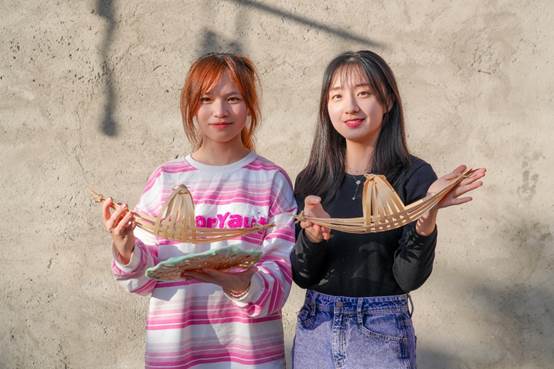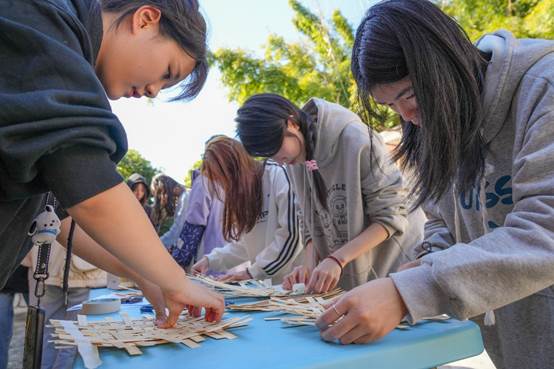 在竹编体验区,社工向师生们科普竹编文化的知识、展示竹编的基本技巧,并指导他们动手操作。在实际操作过程中,师生们逐渐摸索到了“挑一压二,挑三压四”的竹编口诀,编织出了竹扇、竹船等小物件,对竹编技艺产生了浓厚的兴趣。他们纷纷感叹于竹编技艺的精湛和传统手工艺的智慧,并深刻地体会到了耐心、细心和创造力的重要性。