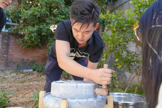 跟随社工的脚步,新华师生们领略了迳下村依山傍水的美丽富饶,了解到迳下村近年来的发展变化,并学习如何动手进行竹编,操作石磨制作肠粉。