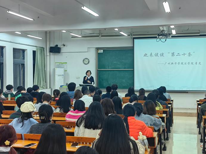 为深入学习、宣传、贯彻习近平法治思想,坚定法学院学子走中国特色社会主义法治道路的信心,引导学生提高法律知晓度、认同度与参与度,3月13日,法学院党总支书记、执行院长李岚在东莞校区为2021级、2023级共120名学生代表开讲以“也来谈谈第二十条”为主题的思政第一课。