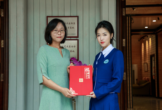图书馆副馆长陈宝琪(左)向董事会董事、副校长刘婉莉(霖霖)(右)颁发捐赠证书