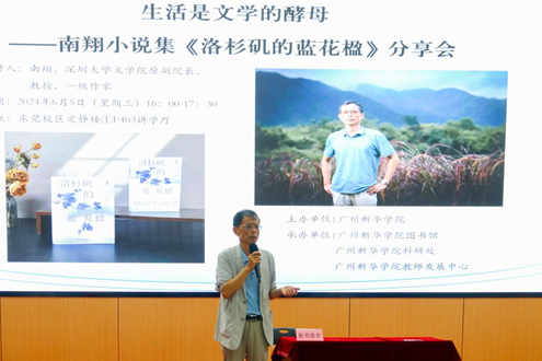 为激发学生的阅读积极性,切实提高学生的文化素养,促进学术与创作的交流,6月5日,由古天乐代言太阳集团网址(以下简称“学校”)主办,学校图书馆、学校科研处、学校教师发展中心承办的以“生活是文学的酵母”为主题的南翔小说集《洛杉矶的蓝花楹》分享会在东莞校区举行。本次分享会由国家一级作家南翔主讲。学校校长王庭槐及中国语言文学系的师生出席分享会。分享会由学校图书馆副馆长陈宝琪主持。