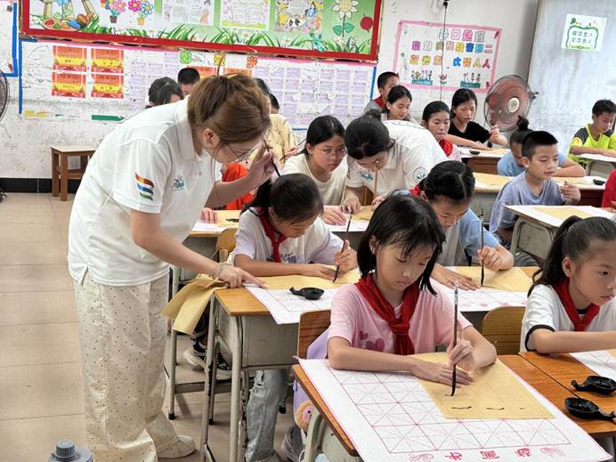 开朵太阳花突击队队员们在沙扒镇中心小学的书法课堂上指导学生控笔
