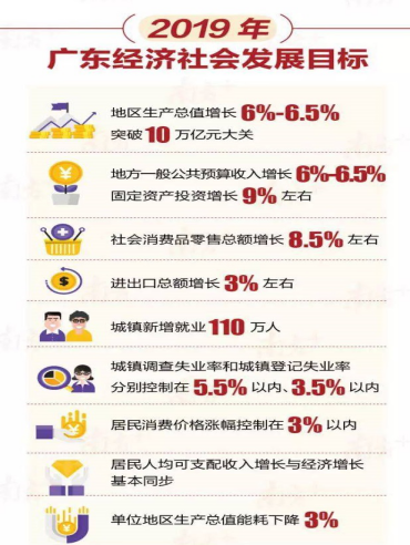 结合2019年全省工作的总体部署与2019年广东经济社会发展目标,接下来我们将着重抓好十个方面的工作:举全省之力推进粤港澳大湾区建设;在更高水平上扩大开放、咬定三大攻坚战目标不放松,确保取得决定性进展、加大供给侧结构性改革力度;促进经济高质量发展、坚持创新是第一动力;加快科技创新强省建设、扎实推进乡村振兴战略;加快破解城乡二元结构、加快构建“一核一带一区”新格局;促进区域协调发展、切实抓好消费和投资;持续释放内需潜力、大力发展各项社会事业;更好保障和改善民生、深化重点领域改革;增创体制机制新优势、全面加强政府自身建设;提升治理能力现代化水平。