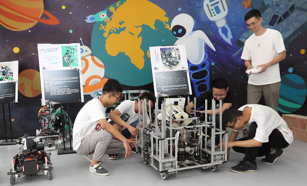 四川大学智能感知与先进控制创新工坊中,团队带头人吴文强正在为同学们演示操作工程车机器人。 张劲松摄