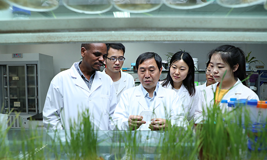 西北农林科技大学旱区作物逆境生物学国家重点实验室小麦-条锈菌互作室里,“小麦癌症”攻克者康振生院士正指导学生观察酵母菌落培养情况。张劲松摄
