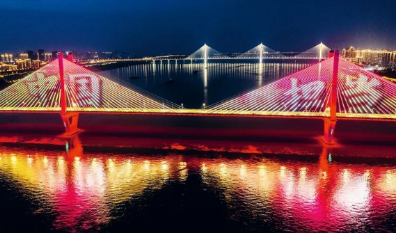在抗击新冠肺炎疫情的斗争中,中国人民万众一心、众志成城,凝聚起强大合力,展现了中国力量、中国精神、中国效率。图为2020年5月2日晚,湖北武汉长江二桥灯光秀打出的“中国担当”画面。中新社发 赵广亮/摄