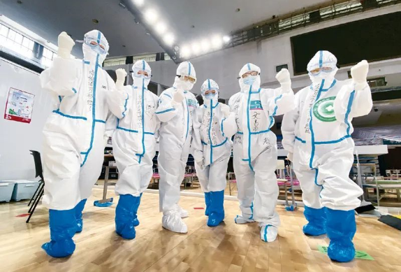 2020年3月10日,武昌方舱医院休舱。待全部患者出舱后,几名护士拍照合影,为武汉加油。湖北日报全媒记者 柯皓/摄