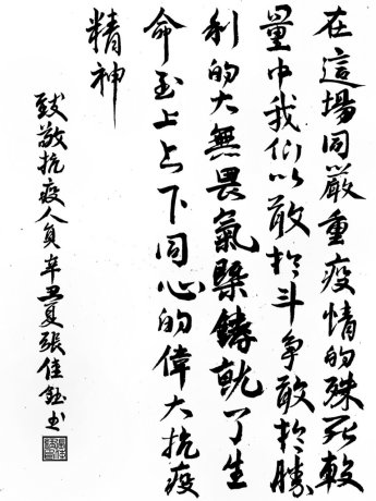 “没有生而英勇,只是选择无畏”。19级艺术设计学专业的钟和霖同学提笔一挥,汉墨流淌,一字一句间,透露出对医护人员、抗疫工作人员深深的敬佩之情与感恩之情。