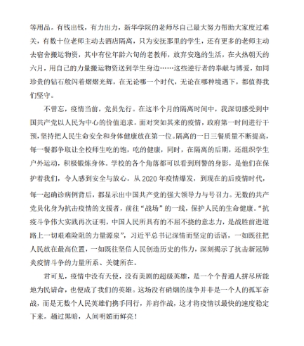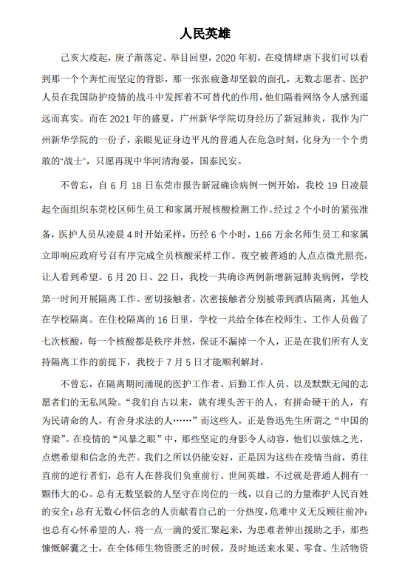18级网络与新媒体专业何紫微同学书提交心得征文——《人民英雄》。“一个个普通人拼尽所能地为民请命,也便成了我们的英雄。”她讲述了疫情期间,学校迅速开展防控工作,医护人员与学校师生携手参与抗击疫情的故事,对各位投身于疫情工作中的“人民英雄”表达崇高的敬意。