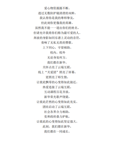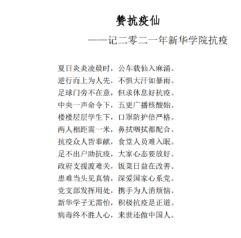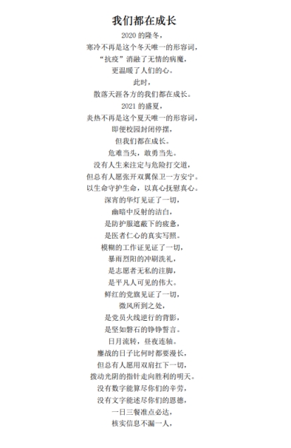 19级网络与新媒体专业简颖怡同学创作诗歌《我们都在成长》。时间是最好的见证者,2021年的盛夏,它见证了新华校园里的无私奉献的医护人员,见证了勇敢逆行的在校师生,见证了一同成长的我们,抒发了对前线抗疫战士的感恩之情。