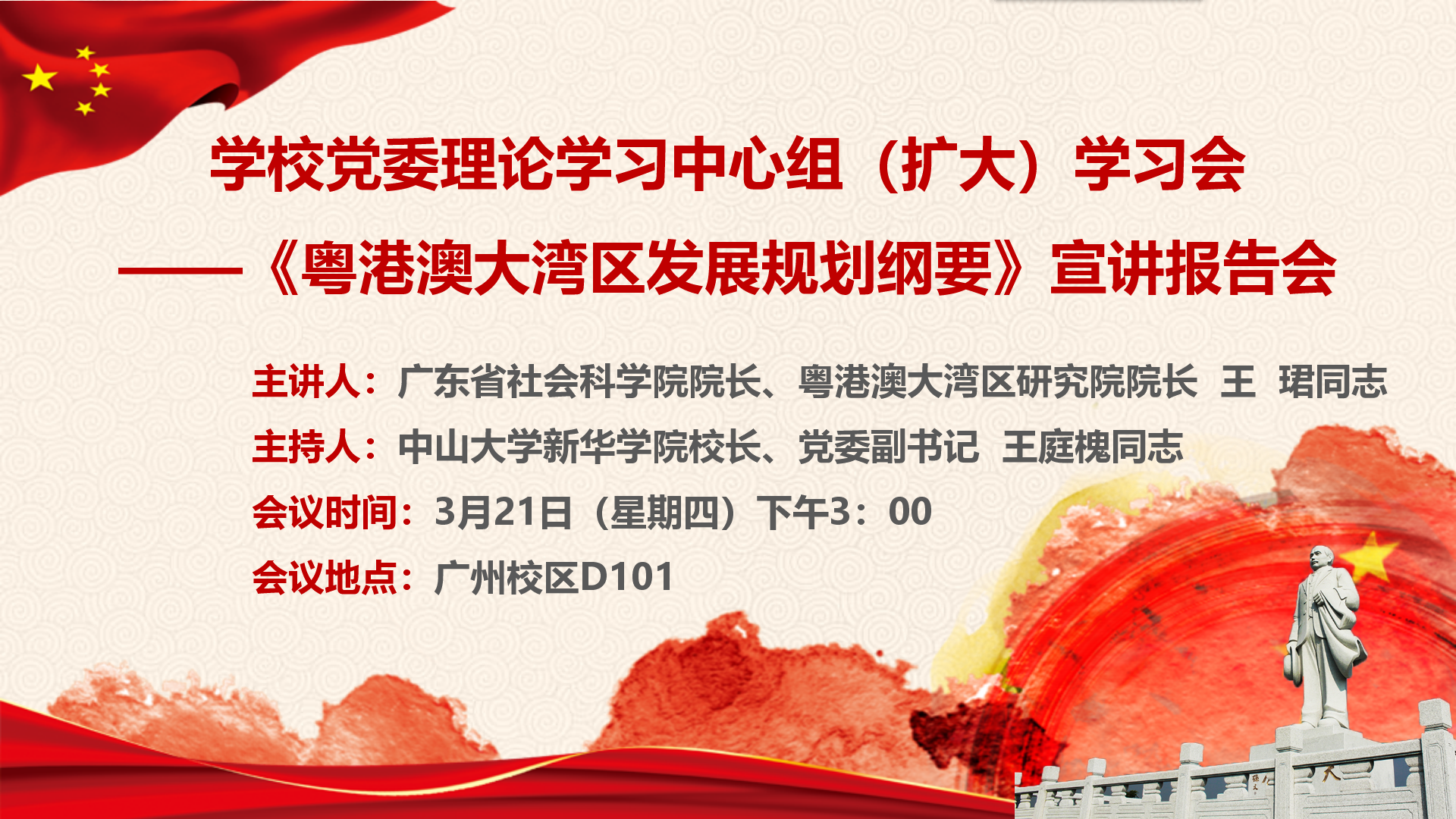 主题:学校党委理论学习中心组(扩大)学习会 ——《粤港澳大湾区发展规划纲要》宣讲报告会