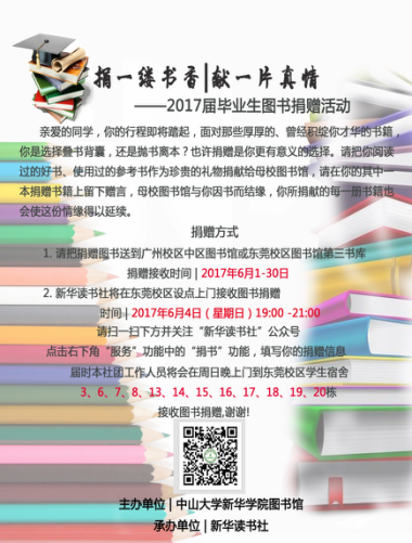 活动方式:请毕业生把捐赠图书送到广州校区中区图书馆或东莞校区图书馆第三书库,请您在其中一本捐赠书上留下您的赠言,寄托您对母校的情怀。