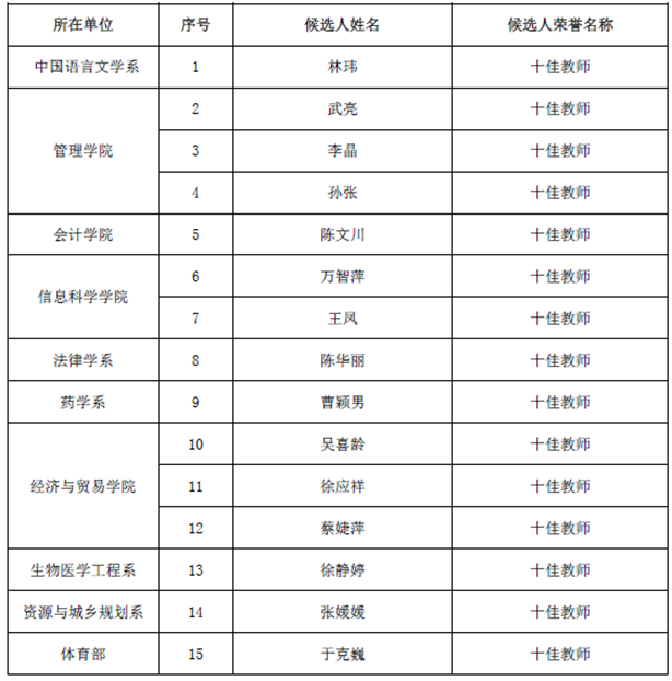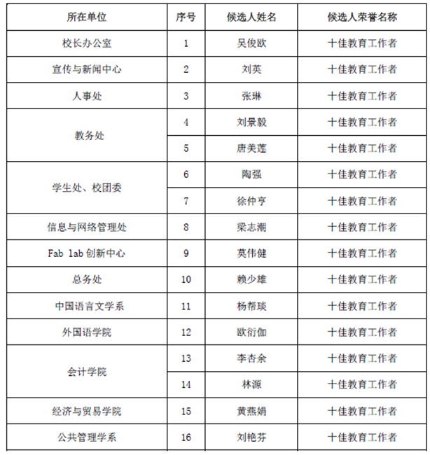 中山大学新华学院2017年十佳教育工作者候选人名单