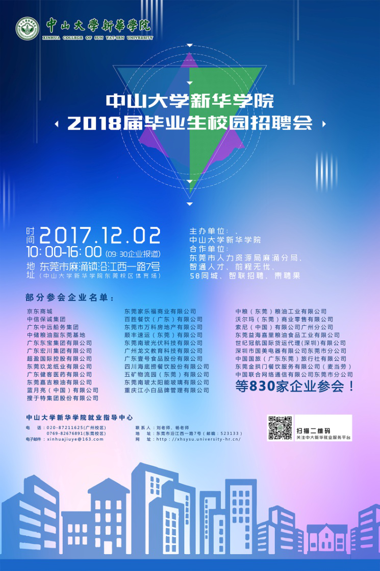 为加强校企合作交流,进一步促进中山大学新华学院2018届毕业生就业,提供企业与毕业生、实习生双向选择的平台,中山大学新华学院将于12月2日在东莞校区举办2018届毕业生校园招聘会。