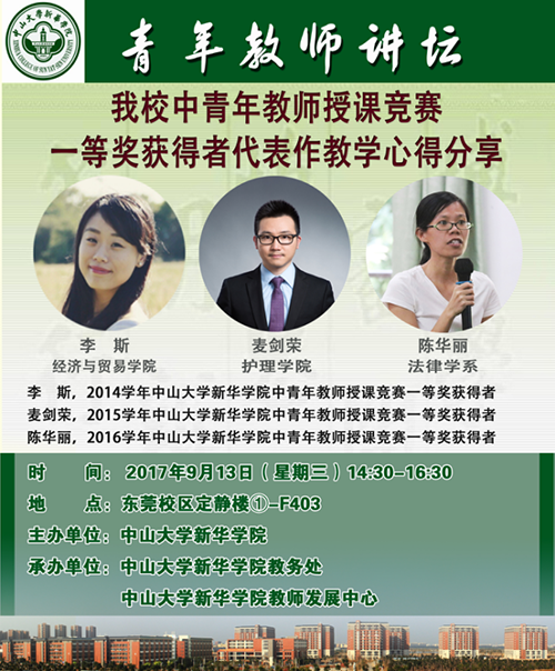 李斯,2014学年中山大学新华学院中青年教师授课竞赛一等奖获得者;麦剑荣,2015学年中山大学新华学院中青年教师授课竞赛一等奖获得者;陈华丽,2016学中山大学新华学院中青年教师授课竞赛一等奖获得者。