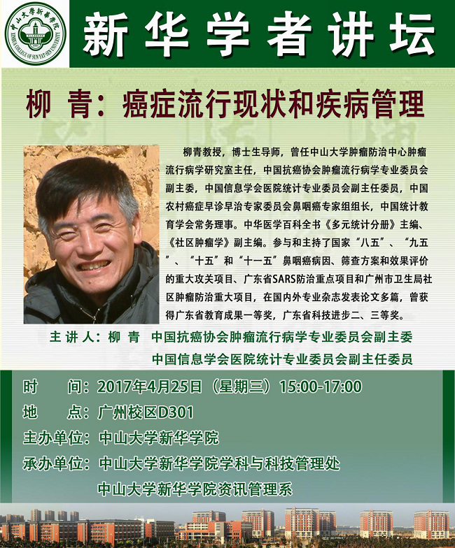 柳青教授,博士生导师,曾任中山大学肿瘤防治中心肿瘤流行病学研究室主任,中国抗癌协会肿瘤流行病学专业委员会副主委,中国信息学会医院统计专业委员会副主任委员,中国农村癌症早诊早治专家委员会鼻咽癌专家组组长,中国统计教育学会常务理事。中华医学百科全书《多元统计分册》主编、《社区肿瘤学》副主编。参与和主持了国家“八五”、“九五”、“十五”和“十一五”鼻咽癌病因、筛查方案和效果评价的重大攻关项目、广东省SARS防治重点项目和广州市卫生局社区肿瘤防治重大项目,在国内外专业杂志发表论文多篇,曾获得广东省教育成果一等奖,广东省科技进步二、三等奖。