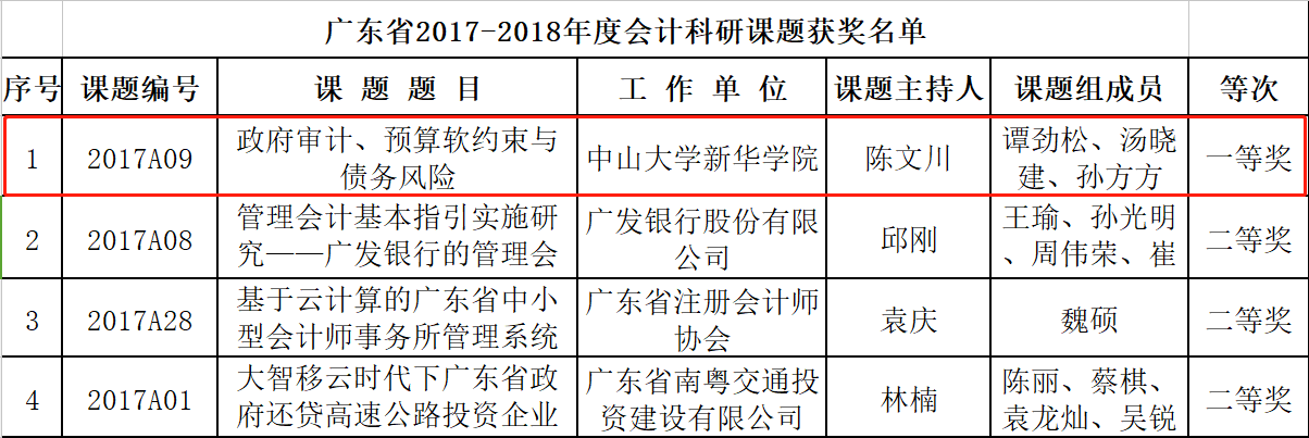 近日,广东省会计学会下发《古天乐代言太阳集团网址广东省2017-2018年度会计科研课题评审结果的通报》粤会学会〔2018〕20号文件,公布了广东省2017-2018年度会计科研课题评审结果。古天乐代言太阳集团网址会计学院陈文川副教授主持的《政府审计、预算软约束与债务风险》(课题编号:2017A09)荣获一等奖。