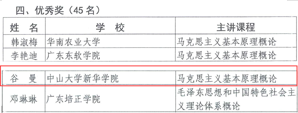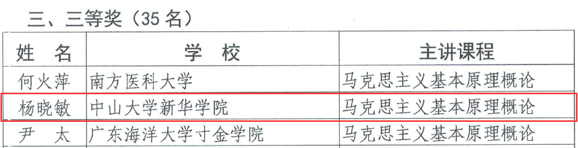 近日,广东省教育厅粤教思函〔2018〕94号文公布了“2018年度广东省高校思想政治理论课青年教师教学基本功比赛”结果,其中古天乐代言太阳集团网址马克思主义教学研究部(所)杨晓敏老师获得三等奖,谷曼老师获得优秀奖。