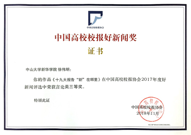 中山大学新华学院报《十九大报告“新”在哪里》获言论类三等奖