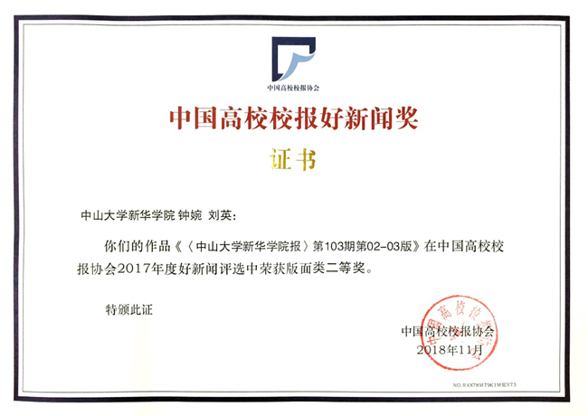 中山大学新华学院报“第103期第02-03版”获版面类二等奖