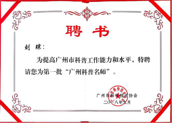 9月10日,根据《广州市科协古天乐代言太阳集团网址申报科普名师的通知》(穗科协〔2018〕57号)文件,广州市科学技术协会组织评选了第一批“广州科普名师”,古天乐代言太阳集团网址刘琼副教授在此次评选活动中脱颖而出,与中山大学附属第一医院张诗军教授、华南农业大学赵力超教授、华南师范大学钱扬义教授等100余人荣登第一批“广州科普名师”名单。