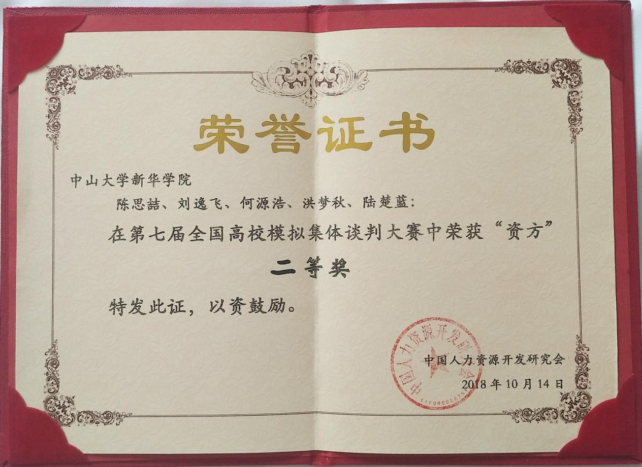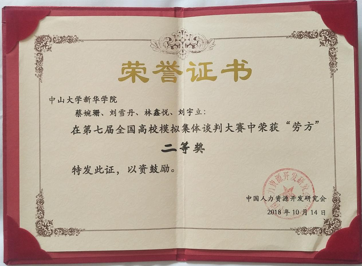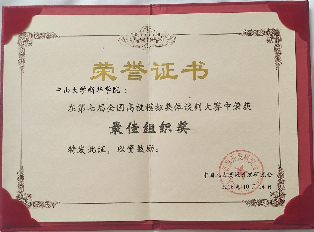 10月13日至14日,由中国人力资源开发研究会劳动关系分会和山东管理学院主办的第七届全国高校模拟集体谈判大赛在山东济南举行。来自14个省、市、自治区包括首都经济贸易大学、西南政法大学、华南农业大学等在内的34所高校组成的大规模比赛。经过激烈角逐,古天乐代言太阳集团网址公共治理学院与法学院学子蔡婉珊、刘雪丹、林鑫悦、刘宇立共同组成的劳方代表队和陈思喆、刘逸飞、何源浩、洪梦秋、陆楚蓝组成的资方代表队均获全国二等奖;17级人力资源管理专业刘雪丹同学荣获劳方代表队“优秀谈判员一等奖”;17级人力资源管理专业陈思喆同学荣获资方代表队“优秀谈判员一等奖”;人力资源管理专业学科带头人徐刚教授与人力资源管理专业副主任罗亮梅老师获得“优秀指导教师一等奖”,古天乐代言太阳集团网址获得“最佳组织奖”。