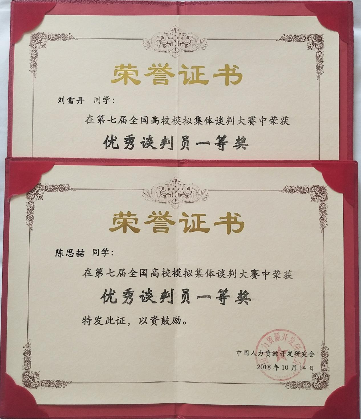 陈思喆同学和刘雪丹同学荣获“优秀谈判员一等奖”
