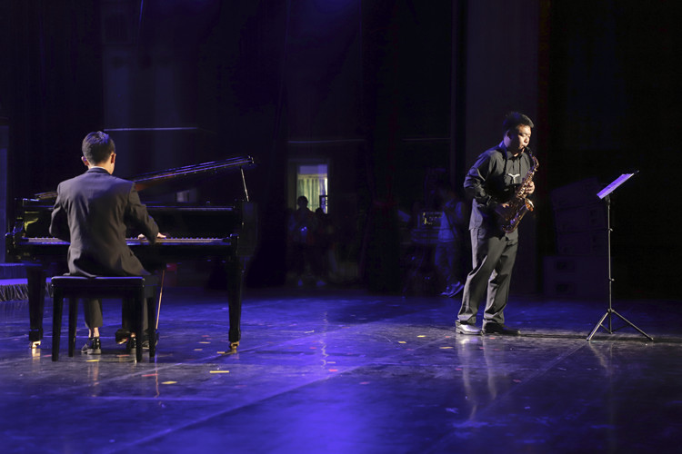 17级计算机科学与技术专业赵祎轩(右)和16级法学专业陈博仑(左)现场演奏《小查尔达什协奏曲》