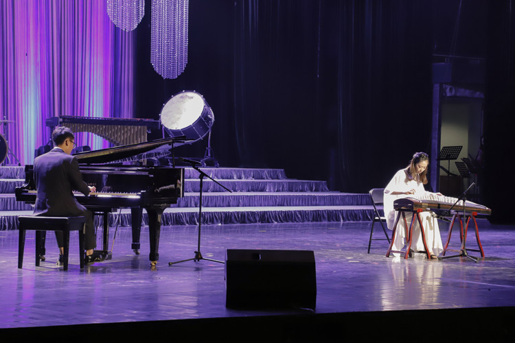 16级经济学专业林诗涵(右)和16级法学专业陈博仑(左)现场演奏《乡韵》