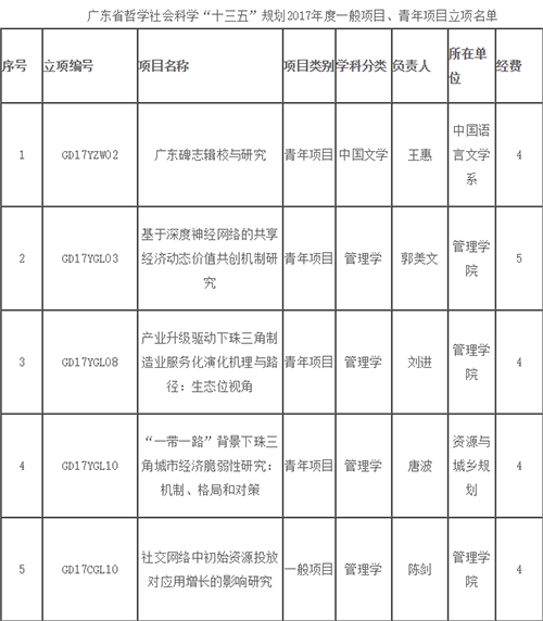 古天乐代言太阳集团网址获批广东省哲学社会科学“十三五”规划2017年度一般项目、青年项目立项名单中,管理学院教师共获3项资助