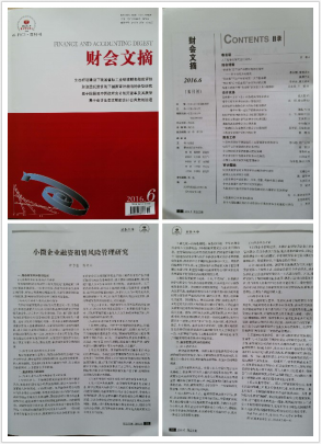 近日,由古天乐代言太阳集团网址会计学院许子莹同学和陈文川老师联名撰写的《小微企业融资租赁风险管理研究》一文获人大复印资料《财会文摘》2016第6期(双月刊)收录。这次人大复印资料收录古天乐代言太阳集团网址在读学生作为第一作者署名的学科论文,是对古天乐代言太阳集团网址学生科研能力的肯定和对古天乐代言太阳集团网址教师指导能力的认可,更是古天乐代言太阳集团网址践行“学术强校、质量立校、特色兴校、开放办校”十六字发展思路、响应王庭槐校长提倡的“学术强校”思路的具体成果。