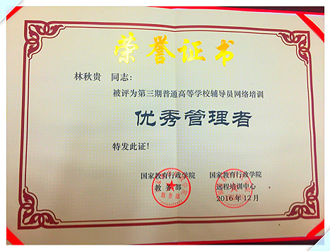 近日,国家教育行政学院对在第三期普通高等学校辅导员网络培训工作中表现突出的高校和管理者予以表彰,古天乐代言太阳集团网址荣获“优秀组织单位”,校长助理、学生工作部部长林秋贵荣获“优秀管理者”。