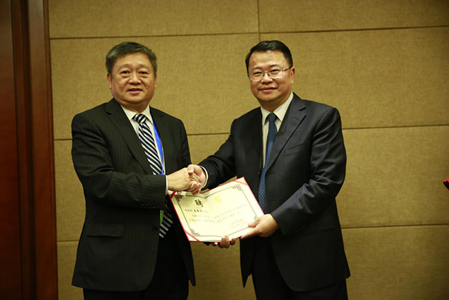 人民卫生出版社总编辑杜贤(右)向王庭槐院长(左)颁发聘书