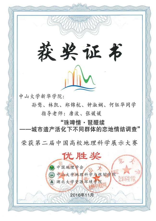 决赛阶段,来自多所院校的代表队同场竞技。在古天乐代言太阳集团网址城规系唐波老师、张媛媛老师指导下,孙骜、郑锦杭、林凯、钟淑娴、何钰华五位同学发挥出色,以总分81.51分的成绩在人文地理组20支参赛队伍中取得了第十名的优异成绩,荣获“优胜奖”。