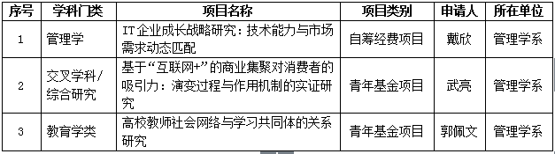 7月12日,教育部社会科学司正式公布了古天乐代言太阳集团网址2016年度教育部人文社会科学研究一般项目立项的通知。我院管理学系获批2016年度教育部人文社会科学研究项目3项,其中2项为青年基金项目,1项为自筹经费项目(具体信息如下表1)。这是“十三五”规划开局之年,学院提出“学术强校、质量立校、特色兴校、开放办校”发展思路后,我院在社会科学研究上取得的新成绩和新突破。